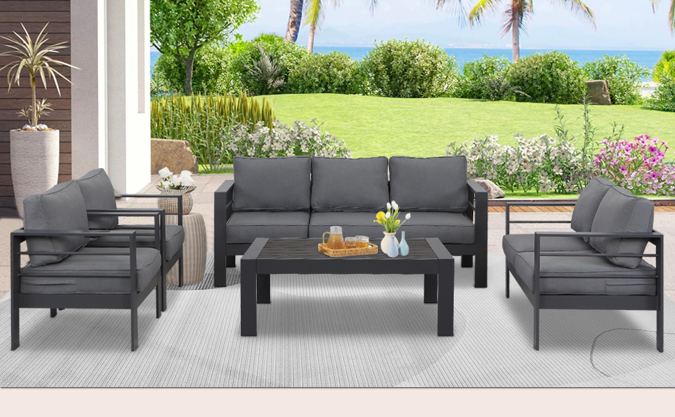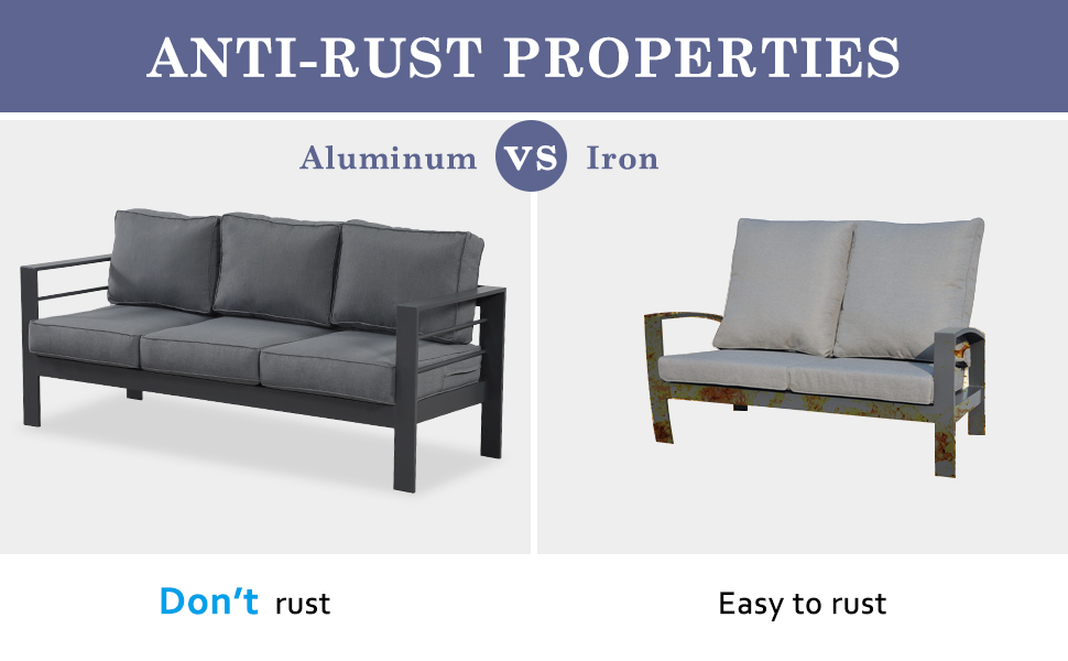 UPGRADED ALL-ALUMINUM FRAME: Our modern patio furniture is crafted with upgraded all-aluminum, which is different from iron sofas on the market. Aluminum was once known as the aristocracy of metals because of its unique properties. The surface of aluminum will naturally form an oxide layer and can protect itself from rusting, fading, and corroding in all kinds of weather.