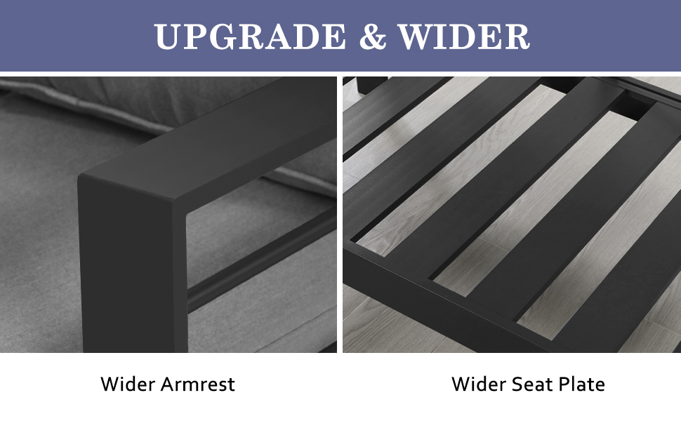 WIDENED ARMREST & SEAT: The aluminum outdoor patio furniture set features widened armrests for better upper-body support, allowing you to lean on comfortably. The thickened seating baseplate can make the sofa stabler. Unlike steel or other materials, the aluminum outdoor furniture set does not deform easily.