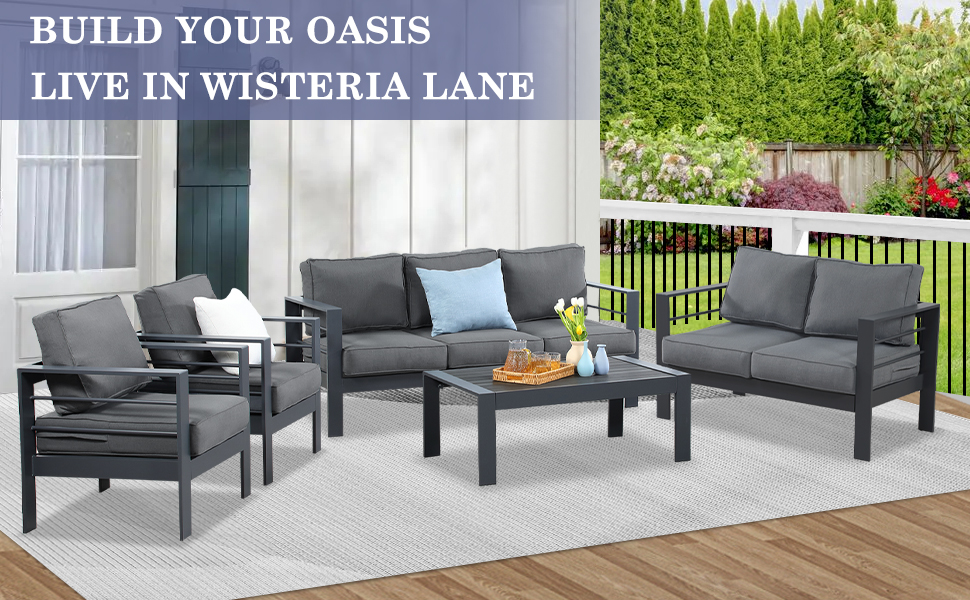 PRODUCT SIZE: Wisteria Lane aluminum outdoor patio furniture set comes with 1 x Three seat sofa, 1 × Loveseat, 2 × Armchair, 1 × Table. Three seat sofa: 73"×26"×32", Loveseat: 50"×26"×32", 2 × Armchair:28"×26"×32", Table: 43"×24"×16". Come and enjoy the outdoors with Wisteria Lane!