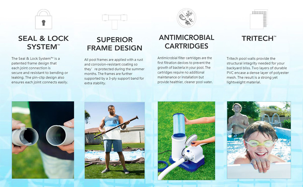 RESISTANT TO BENDING OR LEAKING: The Seal & Lock system is a patented frame design that s each joint connection is secure and won't bend or leak from the water pressure. A pin-clip design is another safety feature to ensure stable joint connections.