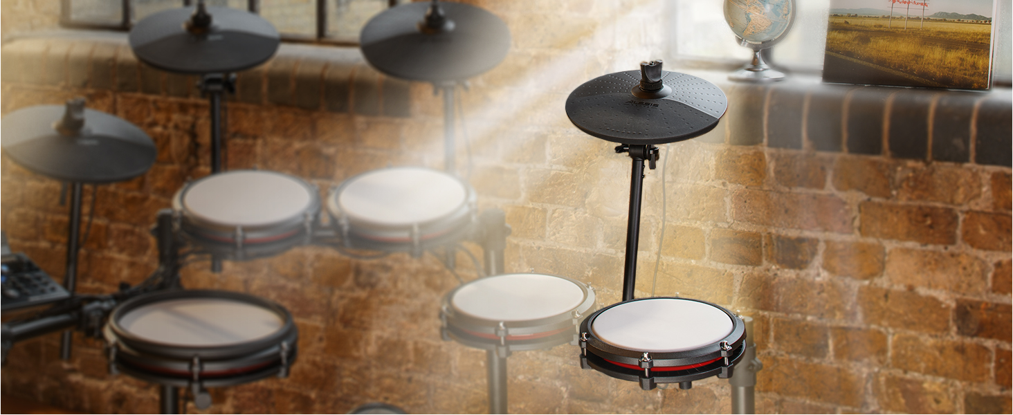 - Genuine Performance Feel - Now bigger 10” dual-zone mesh snare, (3) 8” mesh toms, kick drum tower with pedal and (3) 10" cymbals: ride, hi-hat with foot controller, crash with choke, on a solid foldable rack