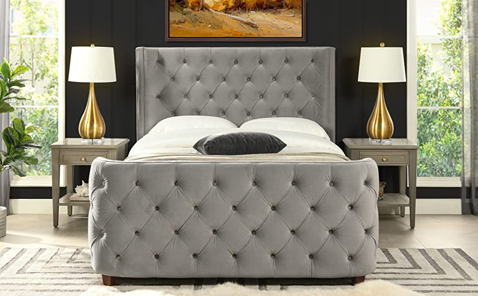 Hand gathered and pulled diamond tufting all along the headboard and footboard