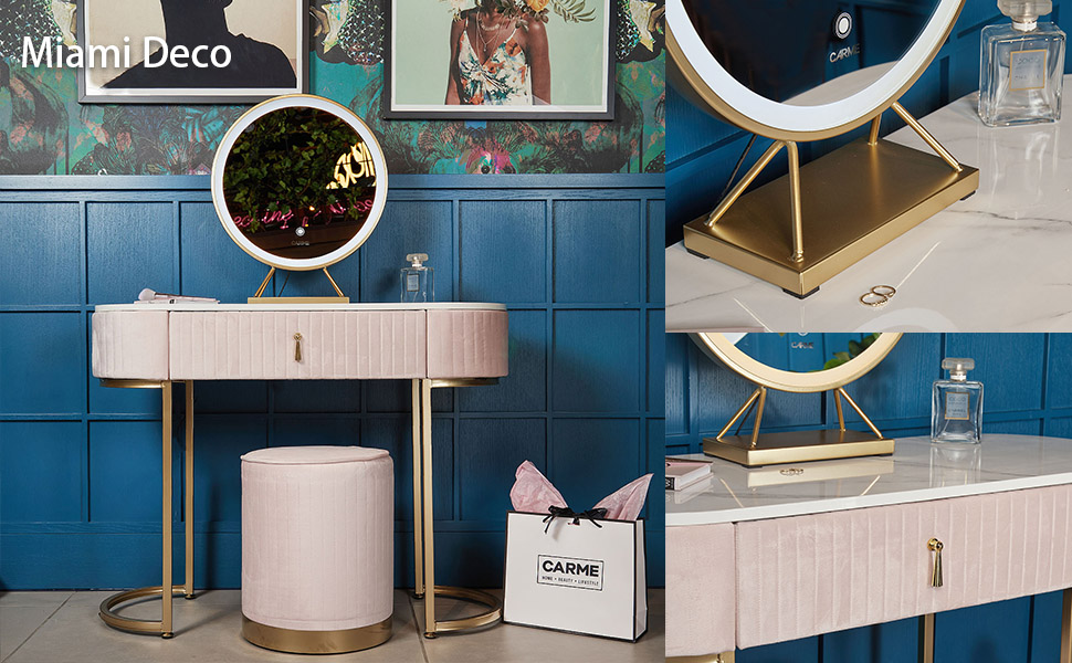 • The removable matching gold circular mirror is framed with a dimmable LED light activated with a touch sensor that has three different colour settings for you to choose the glow you desire; warm, day or cool.