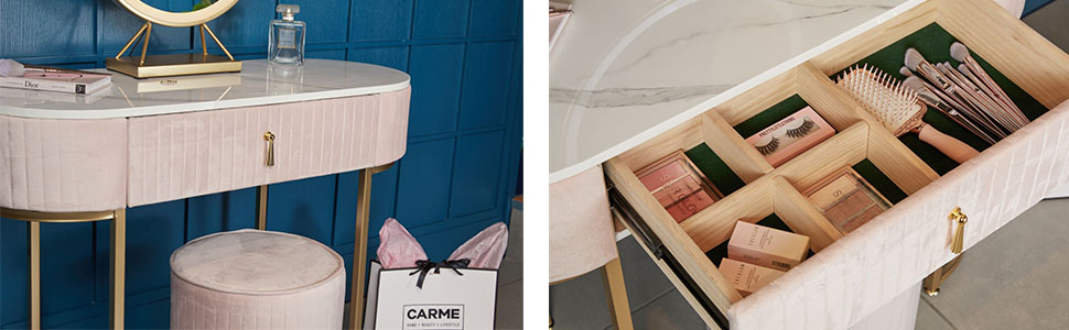 • She has champagne gold legs in an inverted art deco shape, and her a single spacious drawer is adorned with a matching gold tassel effect handle. The white marble effect tabletop is the epitome of luxury and is the perfect place to display your perfume bottles.
