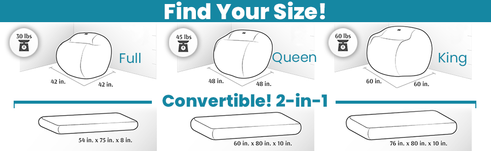 Bean bag chair seats 1 adult (42" wide). Full bed sleeps 1 adult (54" x 75" x 8").
