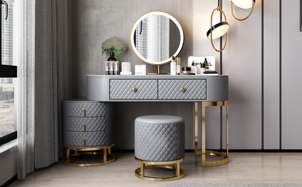 [Easy Assembly & 100% Satisfaction] Vanity makeup set includes vanity table, mirror with 3-color lights, cabinet and cushioned stool. Some assembly is required, but it's all worth it! We stand behind our product, please rest assured to buy and feel free to click "contact seller" if any questions.