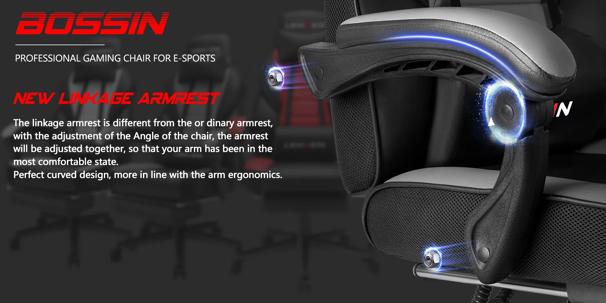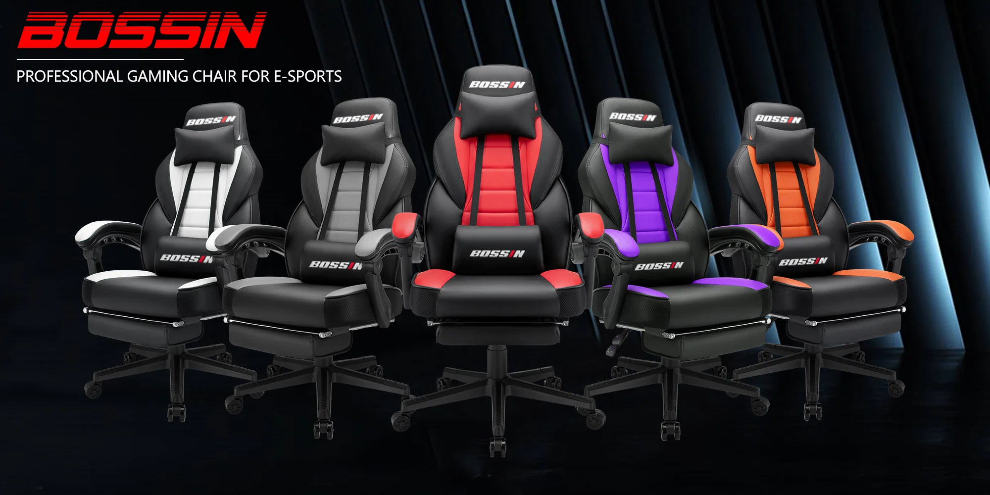 DetailThe Bossin gaming chair is designed for your every need! The gaming chair matches all locations. 360° Swivel and smooth racing caster wheels for mobility; 90°-180° reclining for working, gaming, reading, or napping; retractable footrest for relaxing; adjustable seat height, 400 lbs. capacity; head pillow and lumbar pillow for all body shapes. The winged back provides multi-point body contact to share the pressure and save your spine and lumbar with ergonomic back and massage support. Lean your legs more comfortably with a bucket seat design. The side wing frame has been thinned and contains a more soft filling. Alloy frame covered in quality PU leather and 6 inches of high-density foam for comfort. It is stable enough to serve for years.