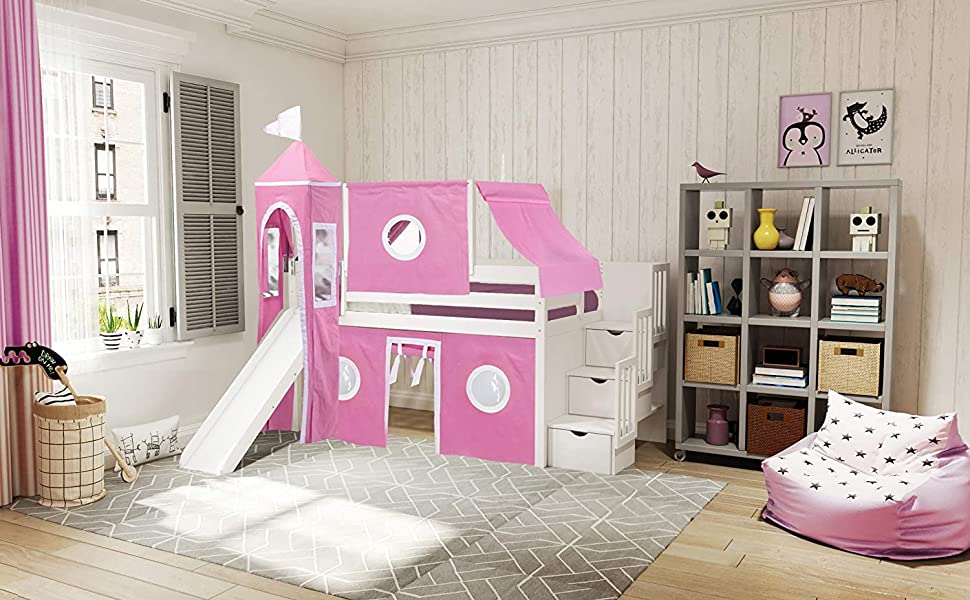 JACKPOT! Princess Low Loft Stairway Bed with Slide Pink & White Tent and Tower, Loft Bed, Twin, White