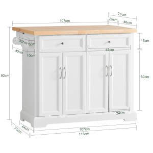 • It has a large worktop with widened board, 2 drawers, 2 cupboards with internal adjustable shelf, 1 towel rack and 4 wheels.